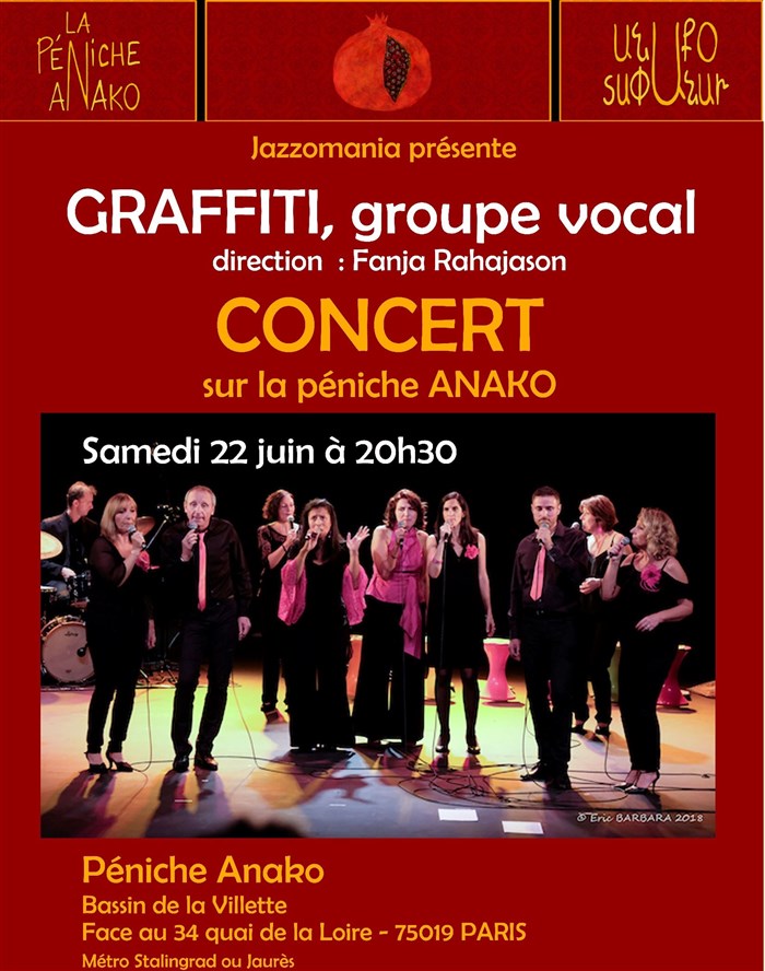 De la couleur, du caractère, un langage bien particulier, beaucoup de fantaisie et un brin de folie : voilà ce que les chanteurs de Graffiti essaient de rassembler avec rigueur et enthousiasme pour unir leurs voix. Depuis la création du groupe en 2006, ces chanteurs éclairés, tous passionnés de jazz polyphonique, mêlent leurs voix avec humour et déhanchés, sous la direction de Fanja Rahajason. Le répertoire nous fait découvrir Nougaro, Gershwin, Marc Berthoumieux, Dave Brubeck, Charlie Parker, Didier Lockwood, Take 6, The Real Group, avec des arrangements subtils allant de 4 à 6 voix parfois.