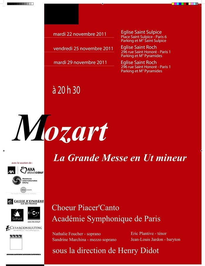 Piacer'Canto est un choeur composé de 80 choristes amateurs et, pour interpréter cette messe de Mozart, s'est adjoint la présence de 4 solistes, et de l'Académie Symphonique de Paris.
