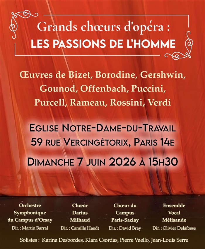 Découvre Grands choeurs d'opéras - Les passions de l'homme, qui fait partie de notre sélection d’événements de type Concerts et qui se tient ici : Église Notre-Dame-du-Travail -