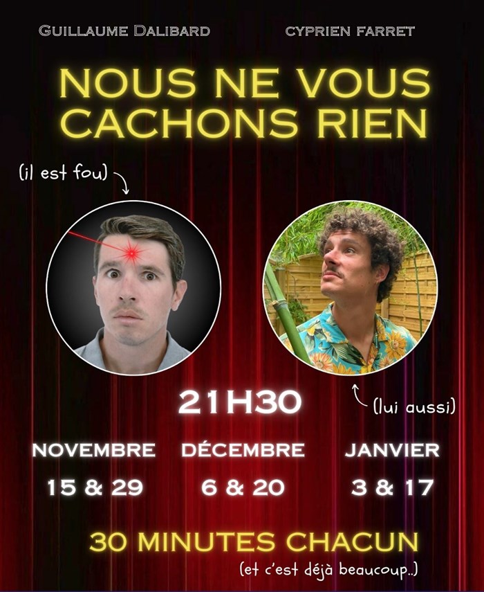 Ce one-man show en deux parties nous a fait passer une soirée mémorable. Cyprien ouvre le bal avec une performance remplie d'humour fin, où l'on se retrouve à rire à gorge déployée dès les premières minutes. Son timing comique est impeccable. La seconde partie, portée par Guillaume, est un véritable bijou d'originalité. En se lançant dans une réinterprétation délirante de l'assassinat de JFK Kennedy, il nous entraîne dans un tourbillon de théories farfelues et de complotisme bon enfant. Chaque anecdote ou hypothèse est un prétexte à rire, et le tout est servi avec une énergie débordante et un sens comique irrésistible. Ces deux univers humoristiques différents se complètent parfaitement pour offrir un spectacle riche, dynamique et intelligent. Si vous avez envie de rire aux éclats tout en découvrant des artistes talentueux, foncez sans hésiter !