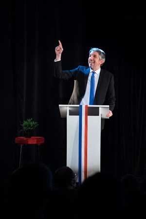 Costard cravate, musique triomphante, drapeau bleu blanc rouge, Guillaume Meurice s'élance dans la foule en serrant des mains, avant de s'installer à la tribune pour dévoiler son programme politique. L'objectif de cette fausse campagne : être le président de tous·tes les français·es, jonglant avec les propositions les plus démagogues possibles.