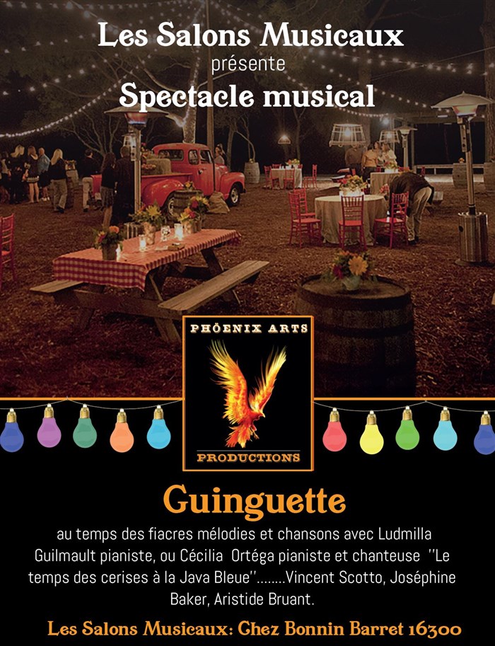 Avec ce spectacle , le piano résonne pour danser, chanter, avec le temps de "guincher", partager avec vous public ces célèbres guinguettes avec les pianistes célèbres Ludmilla Guilmault et Cécilia Ortage, pianiste et chanteuse.