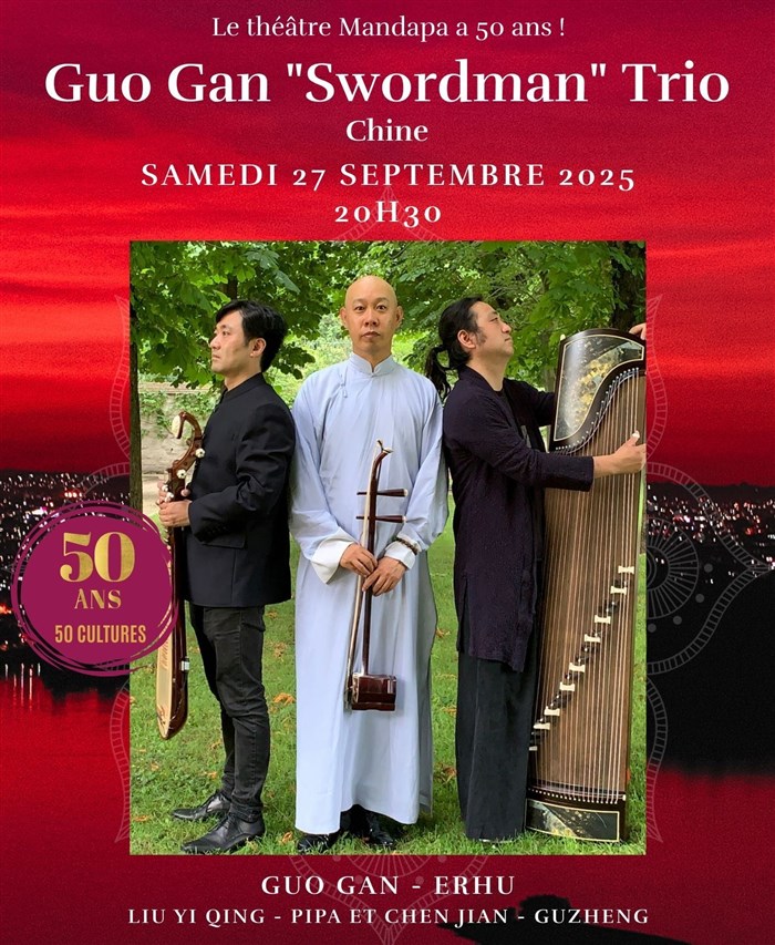 Le maître et compositeur chinois d'erhu (Violon chinois) Guo Gan présente son nouveau trio de musique chinoise. Dans Ce Trio, Guo Gan renoue avec ses racines et forme un nouveau trio, le " Guo Gan Swordsman Trio ", avec deux compagnons experts en instruments traditionnels chinois : Liu Yiqing (pipa) et Chen Jianan (guzheng) Le groupe associe des oeuvres de musique classique aux nouvelles oeuvres de Guo Gan. Le répertoire intègre également des éléments chantés de la poésie de la dynastie Tang.