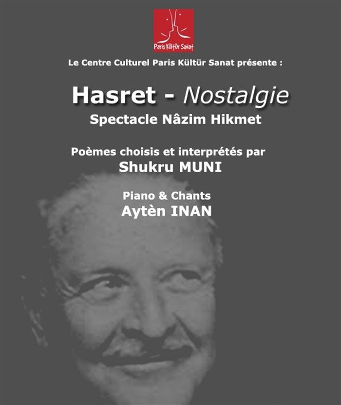 " Hasret- Nostalgie " est un spectacle d'une heure dix, composé de vingt-trois poèmes de Nazim Hikmet (sauf un poème chanté de Bedri Rahmi Eyuboglu), choisis minutieusement par Shukru Muni.