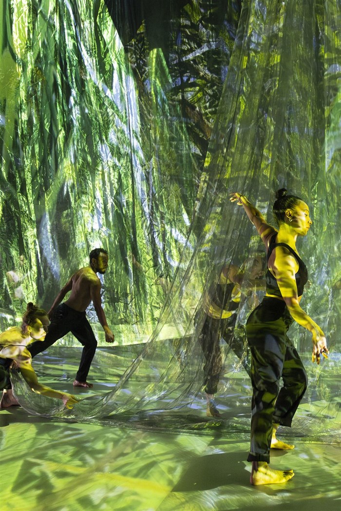 Le titre - en créole - de leur création rend directement hommage à celui qui prôna le métissage des arts et des langages au nom d'une "poétique de la Relation". Jouant sur les complémentarités comme sur les entrechoquements, les danseurs composent un groupe aux singularités entremêlées. À leurs ensembles et leurs échappées répond la musique entre jazz et blues, en partie improvisée, du saxophoniste Raphaël Imbert. De grands voiles translucides projettent des images vidéo de paysages évoquant la luxuriance tropicale.