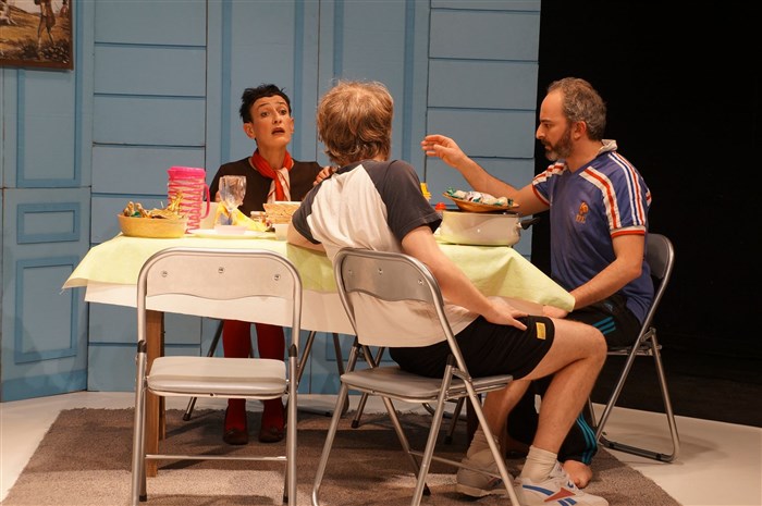 Hélas met en scène une famille composée de Père et Mère, souverains autour d'une nappe, et de Fils et Fille, principaux candidats à l'insurrection.