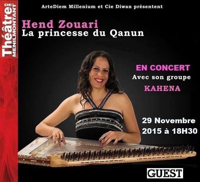 Hend Zouari, surnommée "la princesse du Qanum" originaire de Tunisie, sera en concert avec son groupe Kahena, dans le grand théâtre de Ménilmontant.