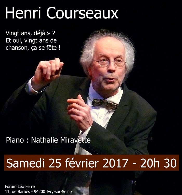 Il paraît que c'est le bel âge, alors, ne loupons pas ça. Il y a 20 ans, jour pour jour, alors qu'il avait déjà 30 ans d'une carrière bien remplie au théâtre, au cinéma, à la télévision, Henri Courseaux, qui depuis longtemps accumulait secrètement du matériel d'écriture, fit ses débuts en chanson. Depuis, il a toujours mené, cette carrière parallèle : Deux albums, et plus d'une centaine de concerts, jalonnent – avec un succès jamais démenti – son parcours d'auteur compositeur interprète poétique et déjanté.