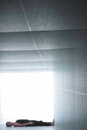 La pièce donne à voir trois corps aphones, comme trois états de vies projetés dans un tunnel de lumière.
