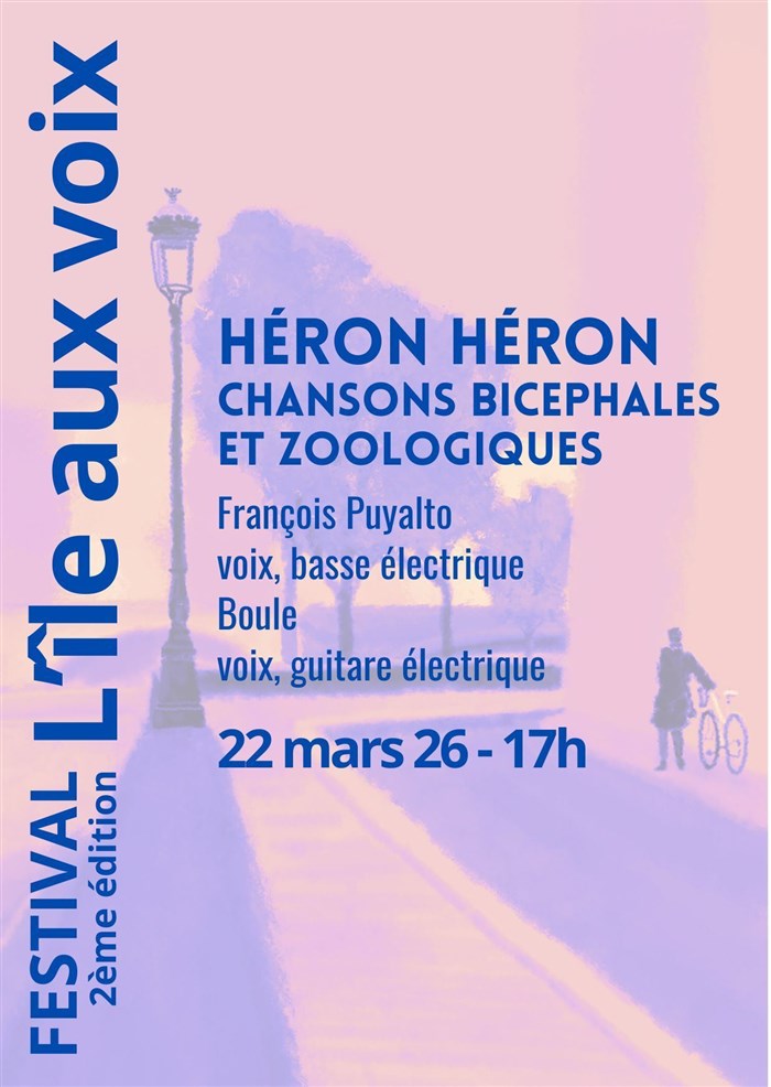 Découvre Héron Héron, Chansons bicéphales et zoologiques, qui fait partie de notre sélection d’événements de type Loisirs et qui se tient ici : Théâtre de l'Ile Saint-Louis Paul Rey -