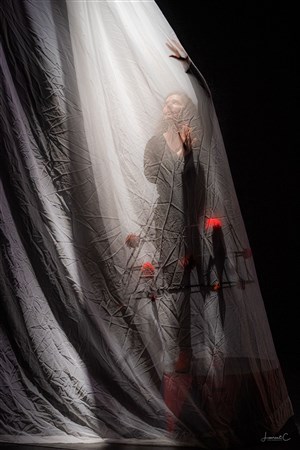 Un tissu aérien sur lequel tombe la pluie, flottent des balles de ping-pong qui se confondent avec la lune et nagent des hippocampes.