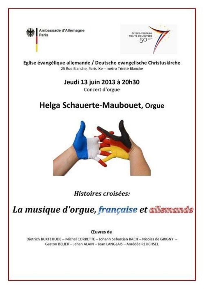 - Conférence : A l'occasion du 50ème anniversaire du Traité de l'Elysee qui, en 1963, officialise l'amitié franco-allemande, Helga Schauerte-Maubouet, organiste et musicologue, parle de la musique d'orgue allemande et française dans le cadre d'un programme représentatif des musiques des deux pays. Au travers de pièces d'orgue sélectionnées du riche répertoire des XVIIe/ XVIIIe et XXe siècles Helga Schauerte révèle les différences dans la conception de l'orgue baroque allemand et français et montre comment, au cours du XIXe siècle, la musique de Bach impose en France un changement radical et irréversible donnant naissance à une nouvelle esthétique d'orgue.