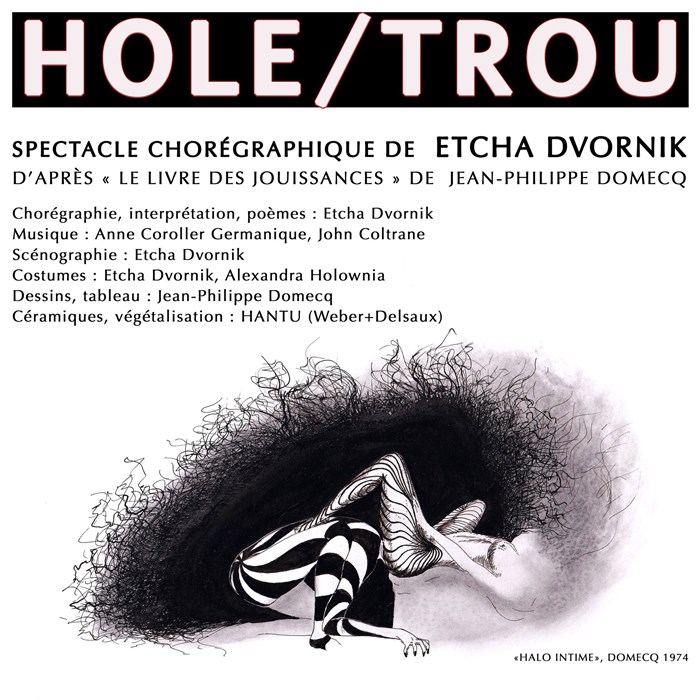 Pour réfléchir à ces jouissances, Etcha Dvornik dialogue avec les textes et dessins de Jean-Philippe Domecq, par ses danses, sa voix, ses mots. Cela donne le spectacle : Hole / trou, ou le Vertige de vivre. En écho à une des propositions de Domecq : "Autant en effet partir du vertige de vivre, puisque on se sait mortel dès le départ. Autant appuyer nos pas sur notre ignorance irrémédiable... Rien de plus sûr que le sol absent".