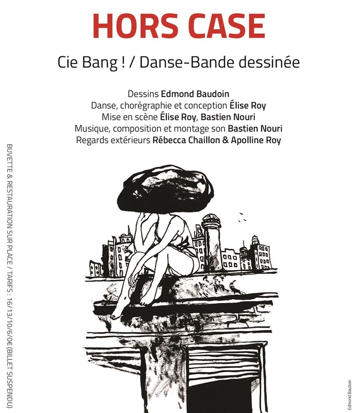 Pour chercher une voie qui lui appartient, une jeune femme revisite son parcours et ses sensations. Sur scène, on suit les cheminements de sa pensée. Les dessins d'Edmond Baudoin apparaissent et disparaissent. Sous la forme de quatre tableaux, ils mettent en scène les différents personnages intérieurs de la jeune fille et la reconnectent à ses souvenirs, à ses doutes, rêves et enthousiasmes. C'est par la rencontre entre le corps et le dessin, à chaque fois différente, qu'elle peut avancer dans sa réflexion. Comme le dit si bien Baudoin : "Pourquoi c'est souvent dans les retours en arrière que je vais de l'avant ?". Hors Case est donc l'histoire d'un voyage : celui d'un corps en mouvement à travers une mémoire dessinée.