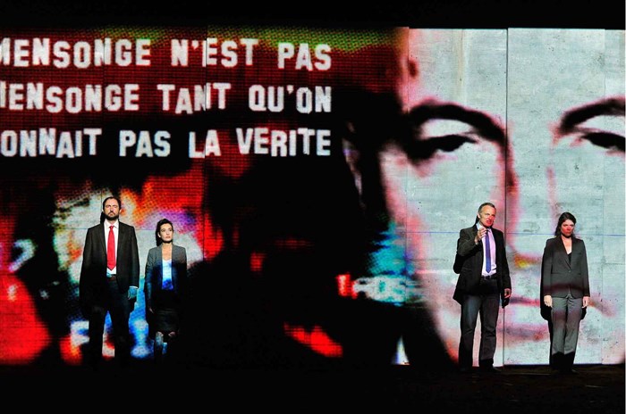 Sous forme de conférence de presse, la pièce dénonce avec force les mensonges d'état, la complicité de certains médias et la guerre comme spectacle.