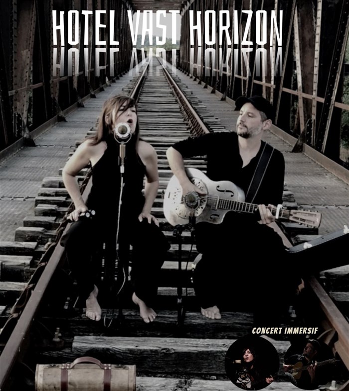 Hotel Vast Horizon nait en 2022 autour du spectacle "Parallel Lines", inspiré aussi du roman Underground Railroad de Colson Whitehead. Hotel Vast Horizon puise son "Blues" dans l'histoire d'Harriet Tubman, icône féminine de l'émancipation des esclaves. Le duo emprunte au Blues d'une Sister Rosetta Tharpe, d'une Koko Taylor, d'un Blind Willie Johnson ou d'un Seasick Steve, explorant ainsi les origines de cette musique séculaire dans le vacarme des rails. Sur scène, Benjamin Coursierest au Stomp, à la guitare à résonateur et guitare électrique des années 40 au son âpre et écorché conjuguées à la voix libre, envoûtante et sauvage de Shantal Dayan : au chant, au tambour Buffalo et Banjolélé.