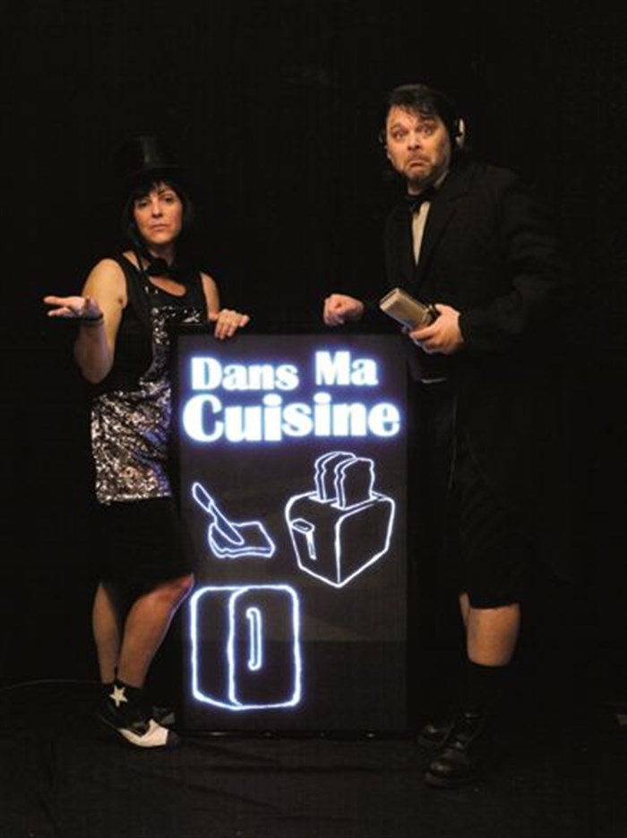 Un petit univers grinçant où grille-pains et poêle-à-frire vous claquent la rythmique, abreuve et inspire les rimes féminines de Mlle Hubert ! Les verres s'y entrechoquent et déversent leurs musiques. C'est accompagnée du Professeur Plume, son acolyte ex-anonyme qui a vécu des années reclus derrière ses machines, qu'elle monte ou démonte, au gré de ses envies, des scènes de la vie quotidienne !