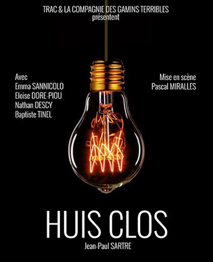 Très belle pièce jouée par 4 jeunes prometteurs ! Sur un texte difficile de Sartre, Ambiance chaude et mouate, dans les entrailles des enfers où 3 personnages tentent de s entraider pour mieux vivre leur mort. Mais c est sans compter sur le triangle de karpman : le bourreau, la victime et le sauveur... mais qui est qui ?.... belle proposition avec de vrais morceaux de guitare électrique ! ( ce serait chouette de la voir sur scene à ce propos ;-) ) pièce VOIR absolument !!!