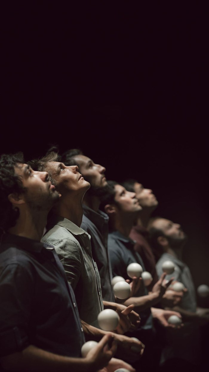 Chez Clément Dazin, " toujours plus vite " rime avec graphique, ludique, chorégraphique ! Il fait de ses sept jongleurs des travailleurs de l'absurde, presque à friser le burn out. Un travail de fourmi que seule la poésie du spectacle viendra humaniser...