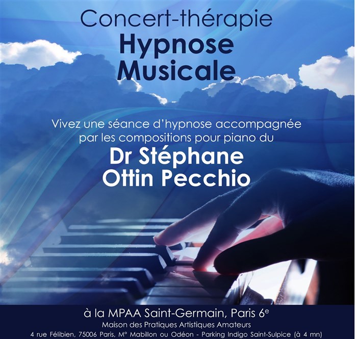 Si vous êtes intéressé(e) par l'hypnose et sensible à la musique, venez découvrir l'Hypnose Musicale créée par le dr Stéphane Ottin Pecchio, hypnothérapeute expérimenté, qui vous propose au-delà du voyage et du rêve, de transformer peut-être, une douleur, une émotion, de changer de point de vue ou de trouver une solution grâce aux vibrations du piano et de sa voix.