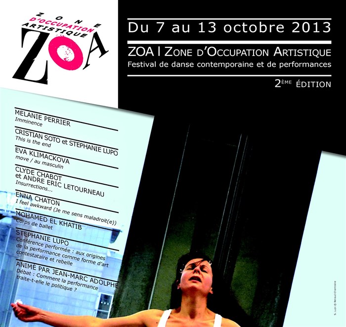 ZOA est un jeune festival de danse contemporaine et de performances initié en 2012 et qui veut donner une visibilité à des artistes émergents.
