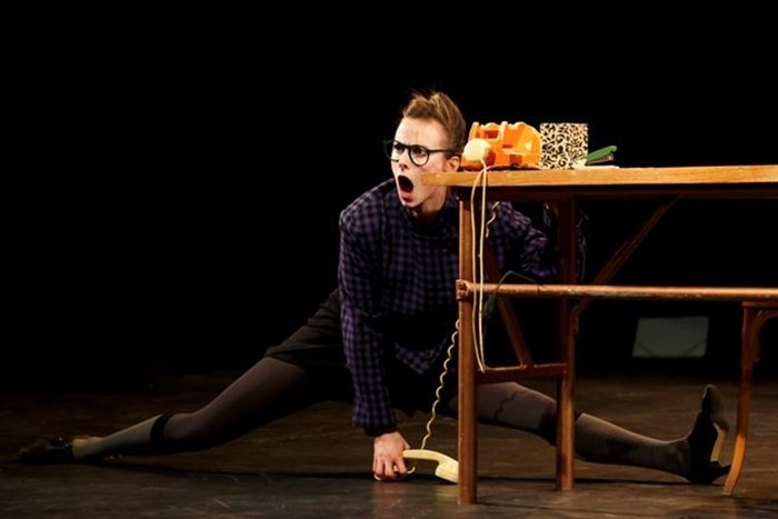 Solo gestuel burlesque. Coté pile, une employée modèle, sur-vitaminée et enthousiaste.