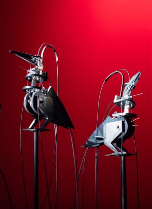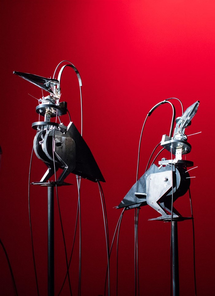 Dans un dispositif unique entre ciel et terre, Marta Cuscunà réussit une fusion intrigante entre voix, corps, masques et images, sous le regard d'oiseaux métalliques qui bougent et parlent tels des dieux.