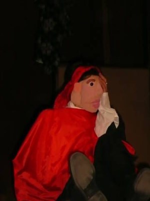 Notre marionnettiste devra improviser avec la marionnette et les objets qui sont sur scène. Mais la marionnette est un garçon, acceptera-t-il de jouer le rôle du Petit Chaperon Rouge ?