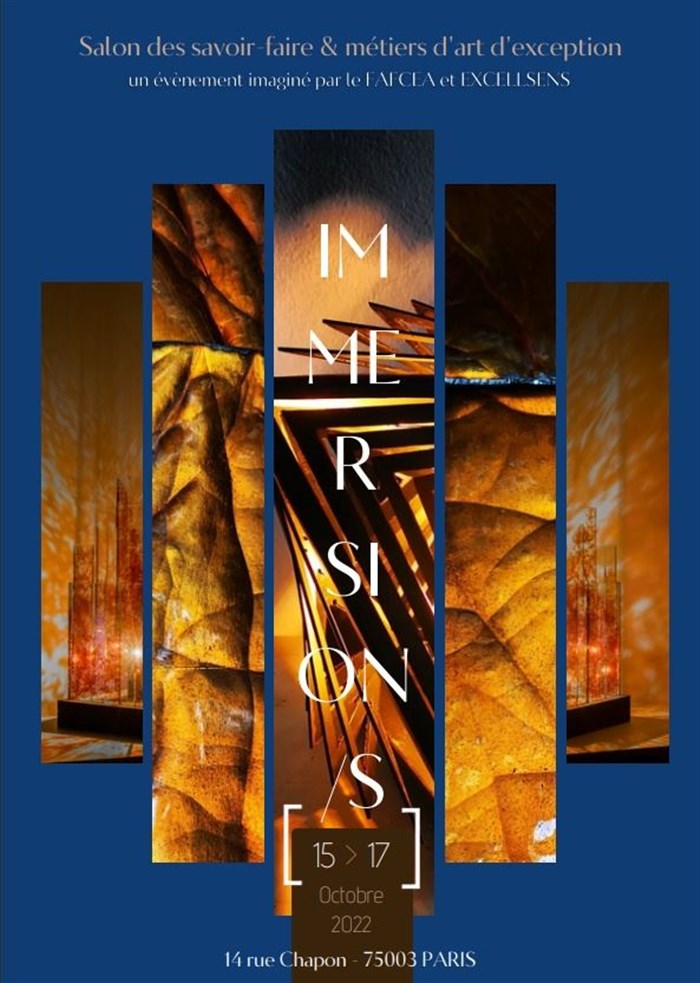 Immersion/s est un salon tourné vers l'avenir des métiers d'art et leur développement à l'international et réunira une vingtaine de créateurs et artisans d'art. Les artistes/artisans sélectionnés proposent chacun, dans un espace dédié, un savoir-faire unique, des oeuvres confectionnées avec un haut niveau de technicité.