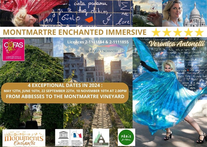 Montmartre Enchanté Immersive, c'est la visite chantée et commentée "Montmartre Enchanté" au départ de la place des Abbesses (sortie du métro Abbesses), qui de site en site, suit un parcours inédit en chantant juqu'au Clos Montmartre où les participants entre dans le vignoble.