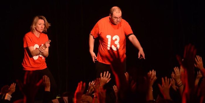 En effet, à son arrivée dans la salle, chaque spectateur donne un mot au Maître de Cérémonie qui animera le spectacle. Une fois le public installé et les joueurs (4 à 6 sur scène), le spectacle peut commencer !