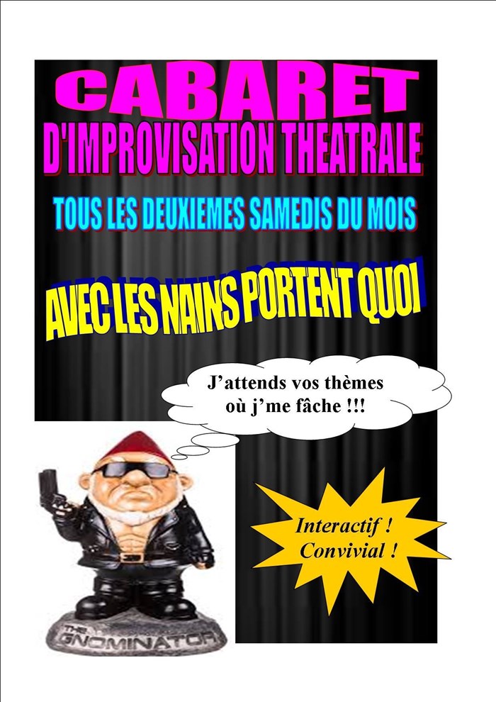 Cabarets d'improvisation théâtrale tous les deuxièmes samedis du mois à 20h30 avec la troupe des Nains Portent Quoi. A partir des thèmes du public, les joueurs improvisent des scénettes inattendues sans se défiler et sans filet...
