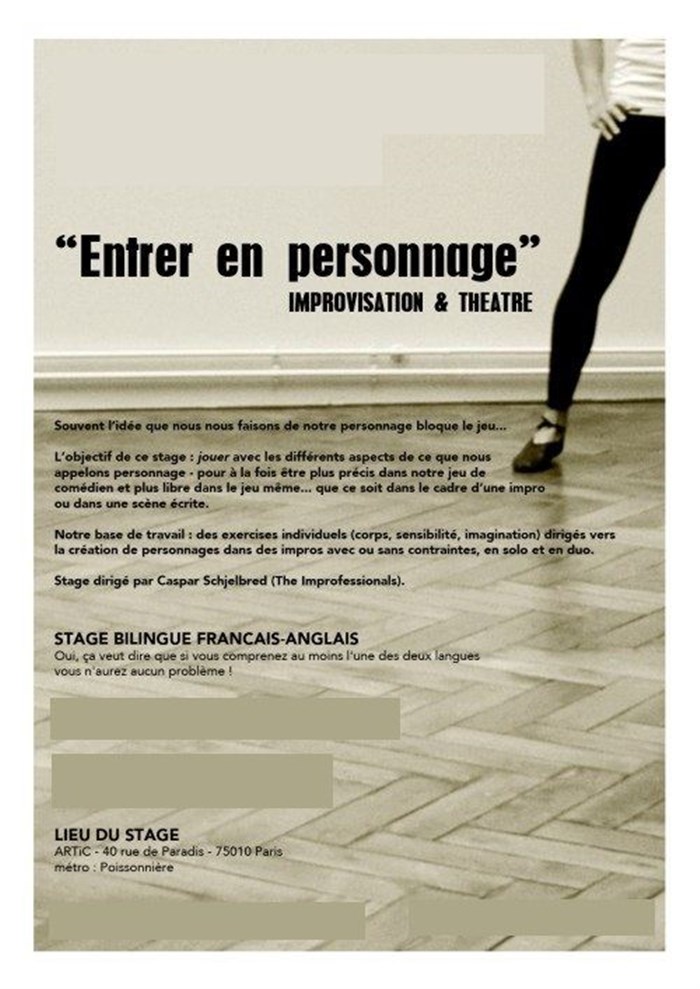 L’événement Improvisation théâtre : entrer en personnage | Stage bilingue français-anglais de type Cours Danse, Théâtre, Clown, Chant, organisé ici :