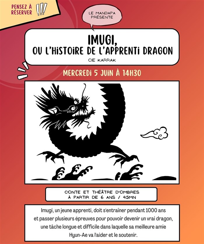 L’événement Imugi, ou l'histoire de l'apprenti dragon : Conte et théâtre d'ombres de type Ombres, Mimes, Marionnettes, Guignol, organisé ici :