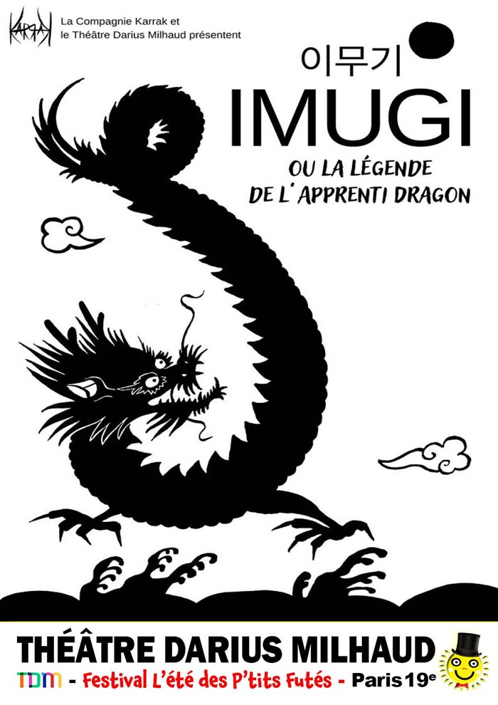 La Compagnie Karrak présente ici un conte original pour théâtre d'ombres inspiré du folklore coréen qui ravira les petits et les grands ! Au fin fond de l'océan, le Grand Roi Dragon s'est endormi. Ses ronflements étaient si forts, qu'ils ont fait éclore un oeuf bien particulier : celui d'Imugi, un jeune apprenti dragon qui n'a qu'une ambition, celle de devenir un vrai dragon !