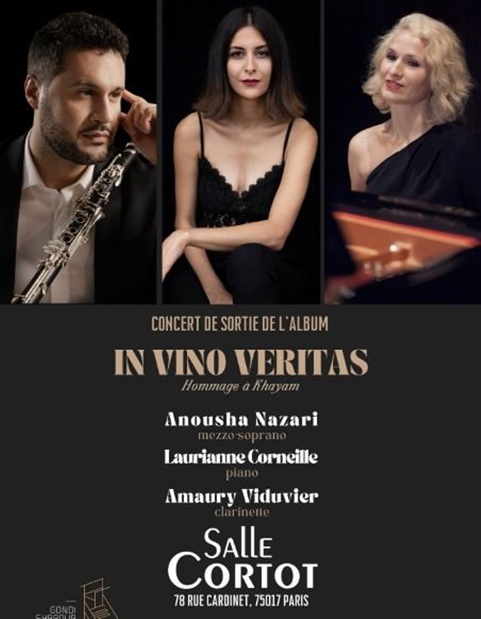 À l'occasion de la sortie de l'album "In vino veritas : Hommage à Khayam", ce concert exceptionnel réunit la mezzo-soprano iranienne Anousha Nazari, la pianiste Laurianne Corneille et le clarinettiste Amaury Viduvier.