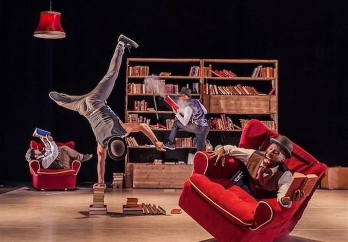 Trois bibliothèques, deux fauteuils, des dizaines de livres et cinq personnages tout droit sortis d'un film muet de Chaplin ou Harold Lloyd, transforment un salon cosy en terrain de jeu.