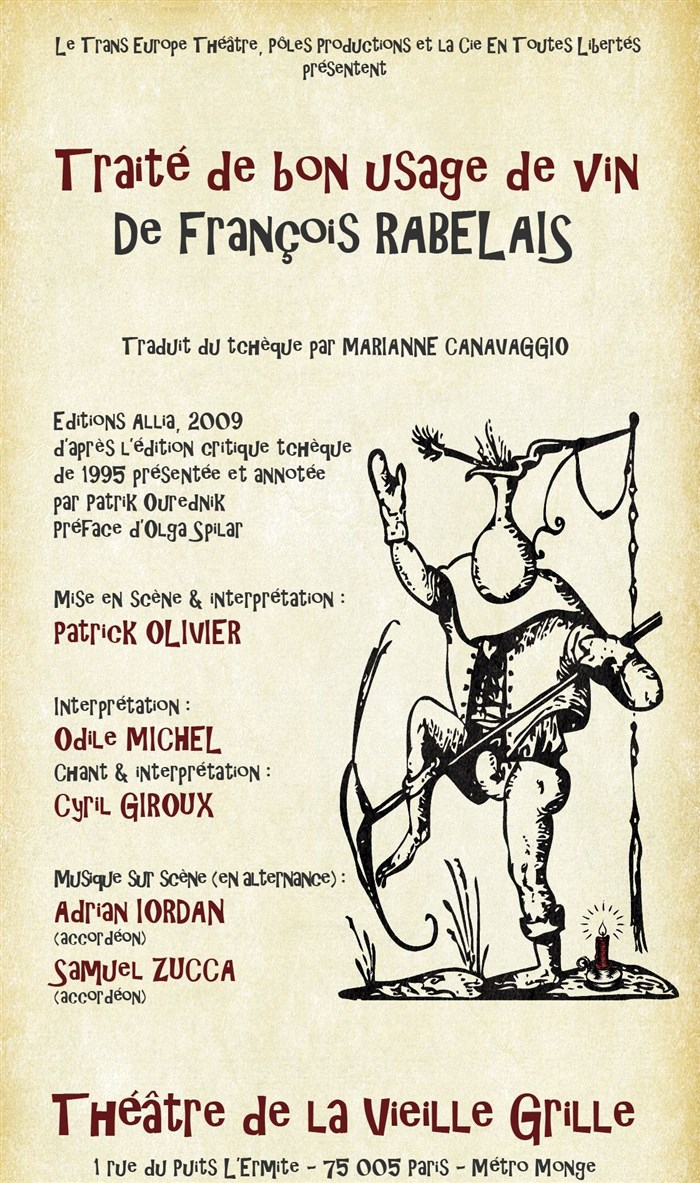 j adore ce petit théâtre de la vieille grille tout d abord pour son atmosphère,son coté authentique petit écrin un rien surané et dans un vrai "jus"...ce qui me conduit à l éloge de la dive faisant frémir les irréductible buveurs d eau,et autres funestes abstinants!Rejoignez sans hâte inutile la confrérie de" enlumineurs de museaux"ce spectacle" Pantagruel..hic,réjouira vos papilles et fera tournoyer vos cellules car malgré quelques petits "couacs"en début de cérémonie celle ci fut en tout point délectable...haut les "choeurs" donc pour la célébration de cette messe.Maître capel"eau"à n en point douter aurait apprécié l exercise.instruc...truc ...tif et in...tel..ligent sans oublier d'être dive..divertissant!Rabelais vous "Dimey" propos et venez vous réjouir vous aussi.
