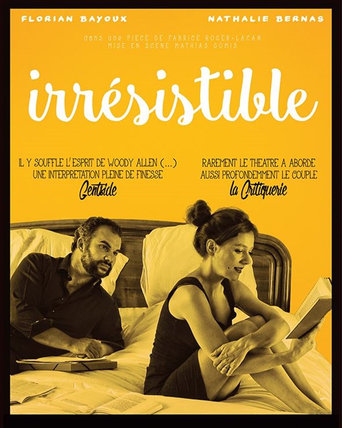 " Irrésistible ", c'est avant tout une pièce moderne remarquable et remarquée sur le couple, écrite par Fabrice Roger-Lacan, auteur entre autres de " Cravate club ". C'est également un texte rythmé par des jeux de mots et de répétitions rendant les situations à la fois absurdes et touchantes. Mais c'est aussi deux comédiens qui interprètent avec brio des personnages pleins de subtilité. Bref,