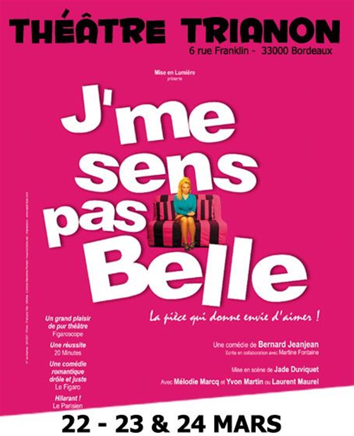 J'ai passé une très bonne soirée à la Grande Comédie, grâce à "J'me sens pas belle". La pièce est à la fois drôle et émouvante et les acteurs le rendent bien. allez la voir, vous passerez un très bon moment!