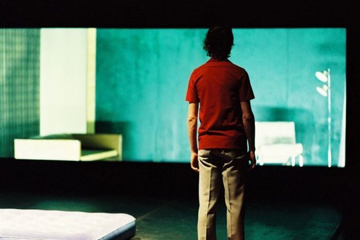 Le public en gradin se trouve très éloigné du décor. Il est équipé de casques d'écoute. Nous sommes à environ douze mètres d'un cadre cinémascope noir derrière lequel apparaît un appartement meublé. L'espace entre public et décor est occupé par deux pôles de production de son. Au sol, au centre de l'espace est posé un matelas deux places, vacant. À l'avant scène, les danseurs viendront dire le texte de Christophe Tarkos.