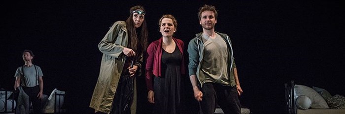Cinq personnages, adultes, reposent sur de vieux lits métalliques, dans un dortoir aux murs noirs. L'espace est propice au désir d'évasion.