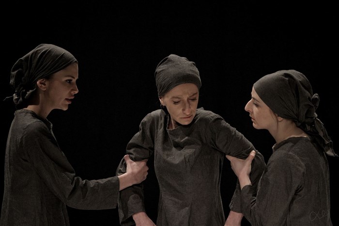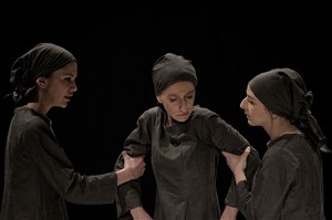 Dans une scénographie épurée à l'extrême, les silhouettes des trois comédiennes se détachent sur un cercle immaculé, ombres des femmes dans le camp d'Auschwitz.