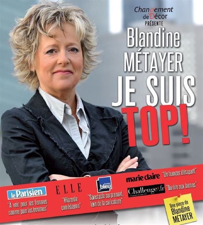 Je suis Top ! est une pièce écrite et interprétée par Blandine Métayer, qui traite avec humour et émotions de l'égalité hommes femmes dans le monde professionnel et dans la société en général.