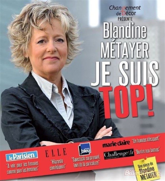 Je suis Top, pièce écrite et interprétée par Blandine Métayer, traite entre humour et émotions de l'égalité hommes femmes dans le monde du travail et de notre société en général.