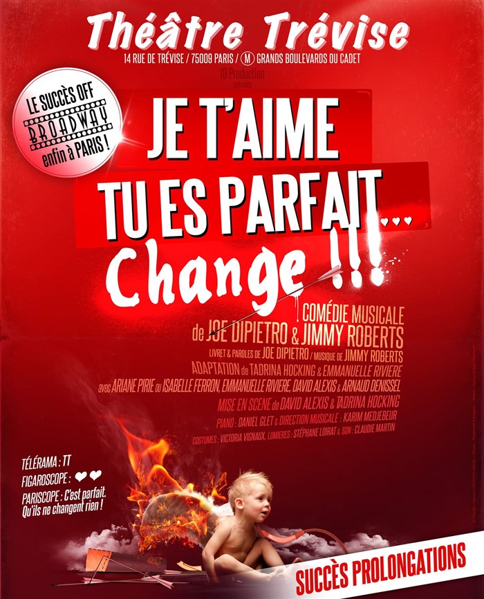 Je t'aime, tu es parfait... Change !!! est la première adaptation française de la comédie musicale "I love you, you're perfect, now change !!!", un des plus grands succès Off Broadway (à l'affiche de 1996 à 2008).