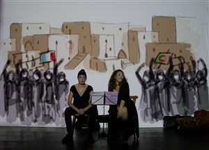 Au diapason de ces deux témoignages criants de vérité, un graphisme à l'ordinateur en vidéo-projection pour une réelle performance convoquant l'intérêt du public des arts visuels et numériques : un dessin qui court durant tout le temps de la représentation, sans trêve, un tracé en continu pour un décor protéiforme. Donner à voir l'Histoire.