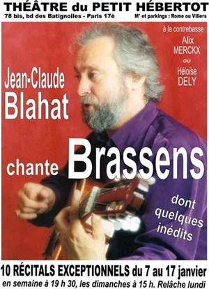 Depuis 1999 qu'il perpétue le répertoire de son ami poète, Jean-Claude Blahat occupe une place à part dans le paysage "brassenien" : accompagné à la contrebasse, il tourne les pages des chansons "incontournables", et y ajoute quatre inédits, quatre textes que Brassens lui a laissés et qu'il a mis en musique. Avec lui, on ne va pas à un concert : on écoute le plus respectueux des interprètes du maître.
