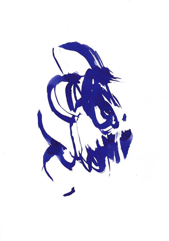 Malgré 1/20ème de vision qui lui reste, l'artiste peut encore s'exprimer, superposant des formes et des lignes en une fuite éperdue liée aux mouvements de la main et du poignet. Arabesques se dessinant à l'horizon du trait et enveloppant les rapports entre les masses, veines de lumière blanche traversant la matière noire, rouge ou bleue éclatée de l'encre de Chine, l'énergie de la création se libère à travers ce geste essentiel, libre dans sa contrainte, obstiné et toujours renouvelé.