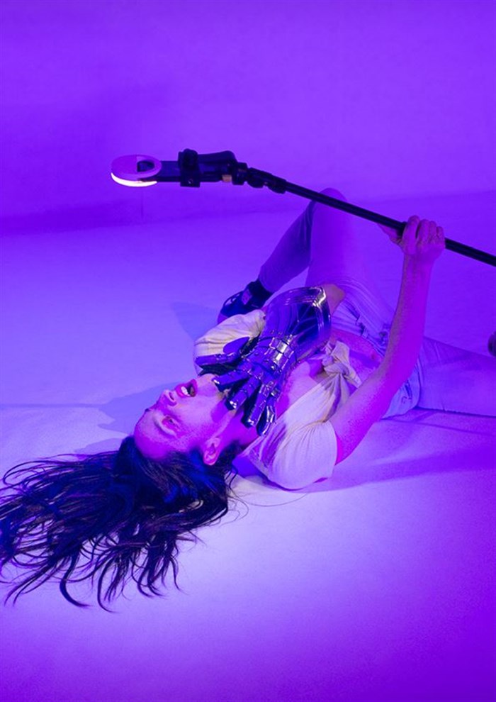 Sur scène, dans une scénographie conçue par Nadia Lauro, c'est elle qui réalise en direct le film de cette adolescente, projeté sur deux écrans qui encadrent la scène. À la fois filmeuse et filmée, elle créé avec la caméra du téléphone un corps hors-normes, iconique et fantastique, et fait pleinement exister ce personnage plein de bruit et de fureur.